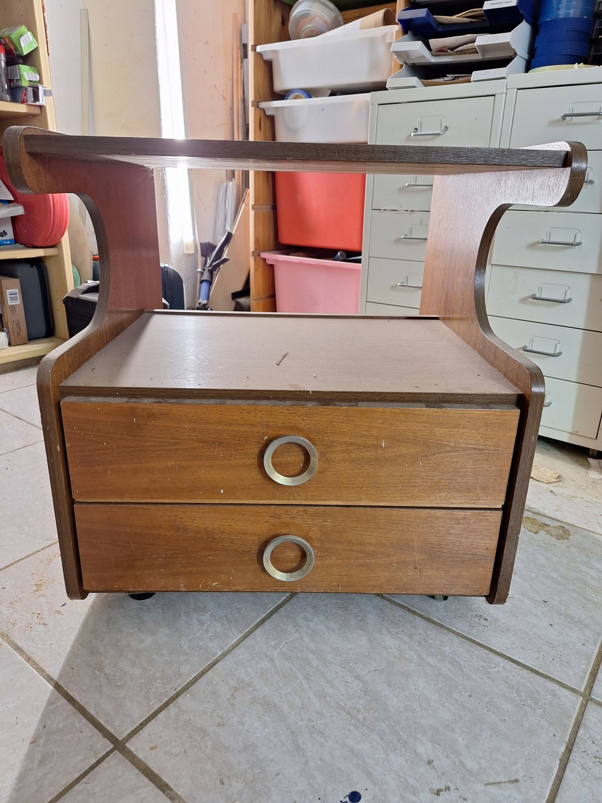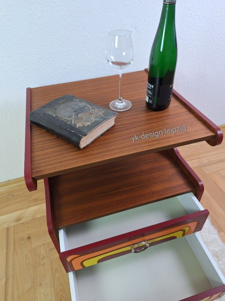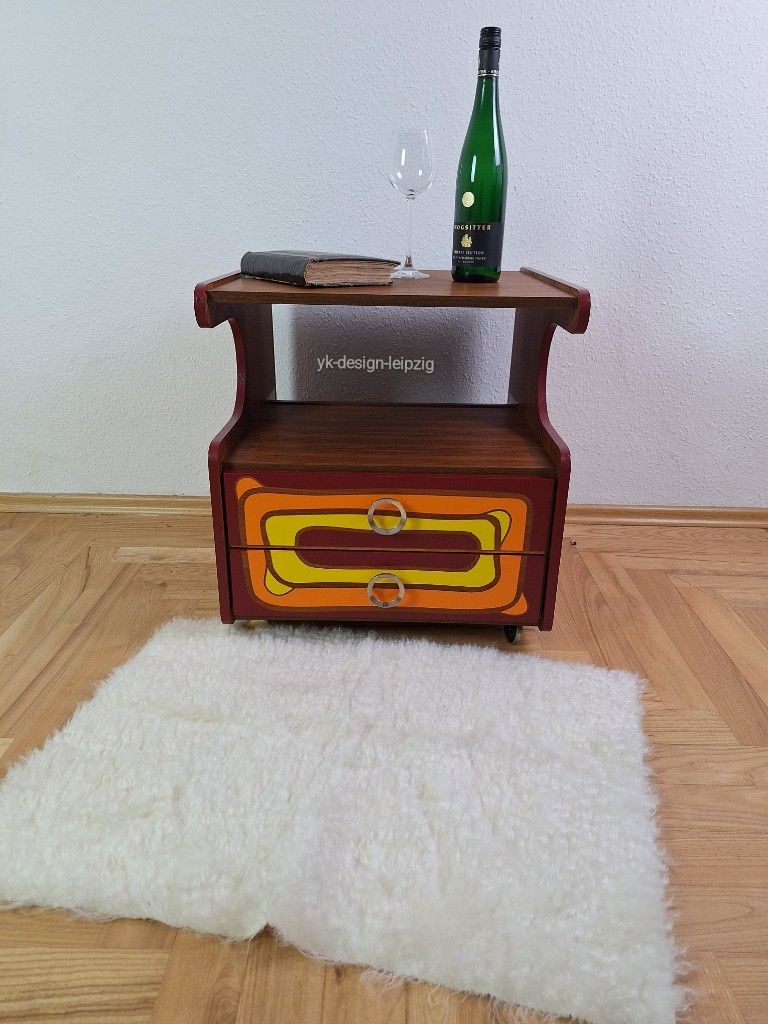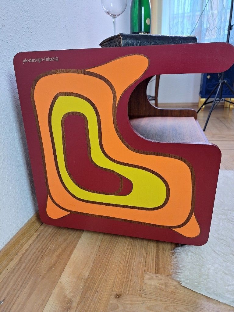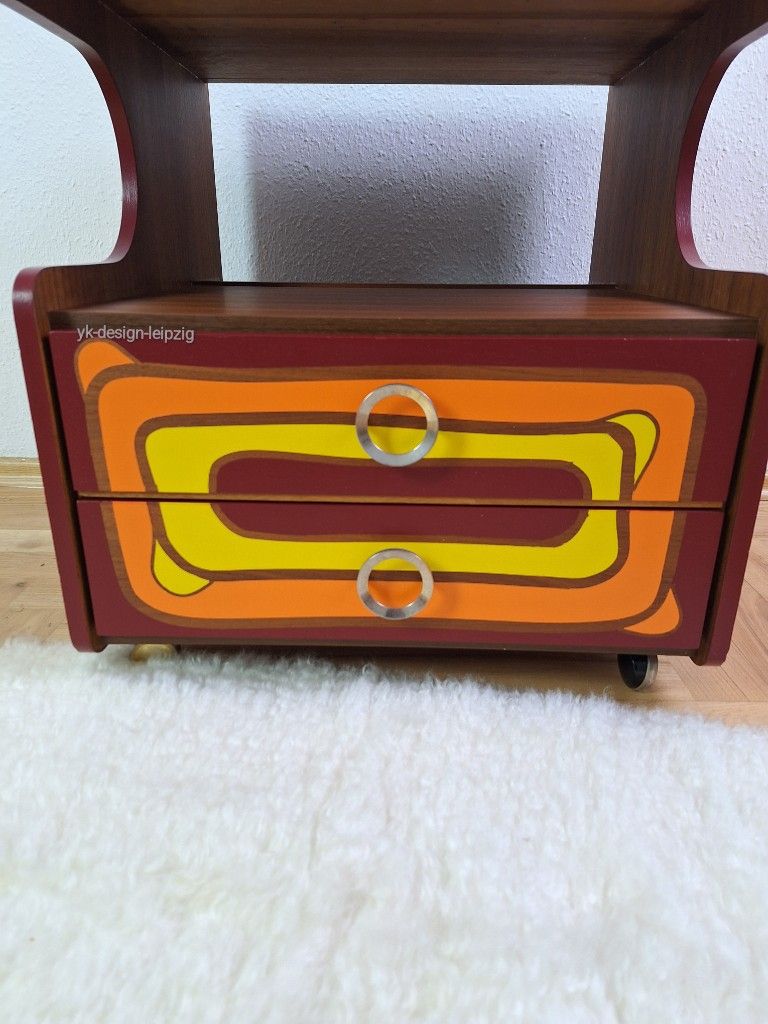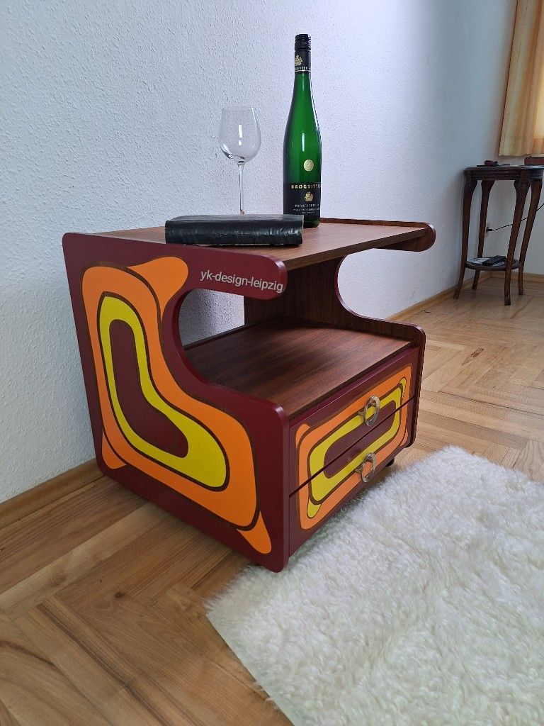 Diesen kleinen speziellen, aber unscheinbaren Schrank habe ich aufgearbeitet und ein 70er Jahre-Stil verpasst. Ich habe mich von der Form des Schrankes inspirieren lassen. An der Rückwand verbirgt sich ein kleines Abstellfach für Zeitungen, Bücher oder Weinflaschen für einen gemütlichen Abend. Schon verkauft!